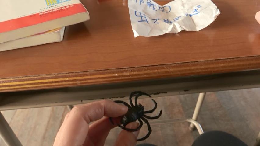おもちゃのクモを見つけて大激怒