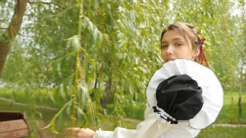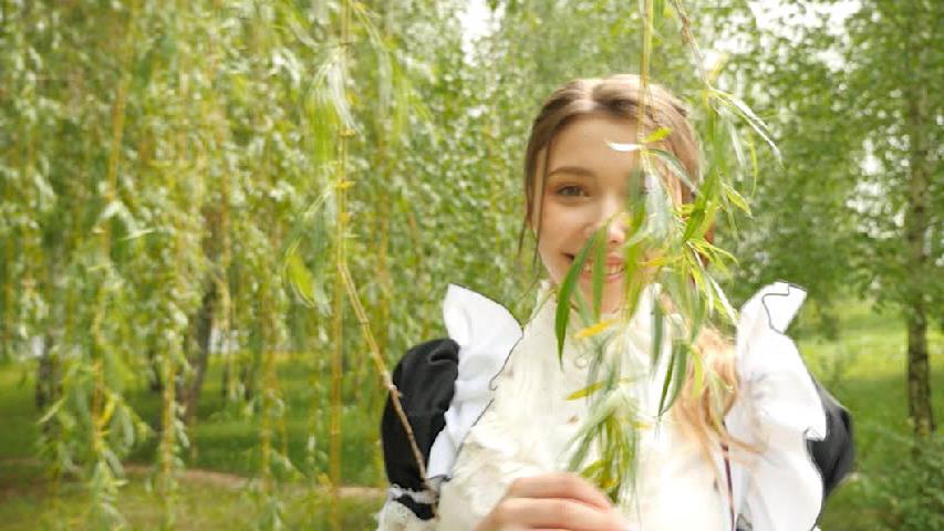 トップレスのまま白樺の木を手にします